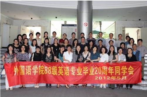 在88级英语毕业生中,现有高校与中学任教的骨干教师、政府部门任职的公务员、商界精英、成功创业的企业家,也有不少已定居国外。他们在不同行业中辛勤劳动,为母校争光,为社会创造财富。20年前的书生青年,如今都已是各自领域的中流砥柱;昔日同窗雨声书声,今日相逢歌声笑声。同学会上,当年的语音课老师、八十高龄的叶东炜老师有感而发,一直惦记着每一位学生,为了能够认出88级的所有同学,他在同学会前一天特意找出当年的学生名单,仔细熟识了一番,令在场师生感动。参加活动的校友也逐一对自己毕业至今的情况作了简单的描述,在异地未能赶来的少数校友,也特地发来短信表达了自己对老师和母校的祝福。
