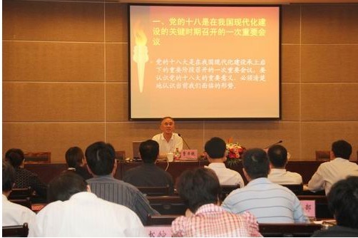 报告会上,曹教授结合自己的学习理解,着重从十八大召开的重要意义和如何做好当前工作,迎接十八大两方面进行了详细阐述。他认为,下半年即将召开的党的十八大是我国现代化建设时期承上启下阶段召开的一次重要会议,要从当前我们面临的发展形势正确理解十八大召开的意义,要坚持以科学发展为主题,以加快转变经济发展方式为主线,以稳中求进为总的工作基调,全面做好各项工作,迎接十八大顺利召开。