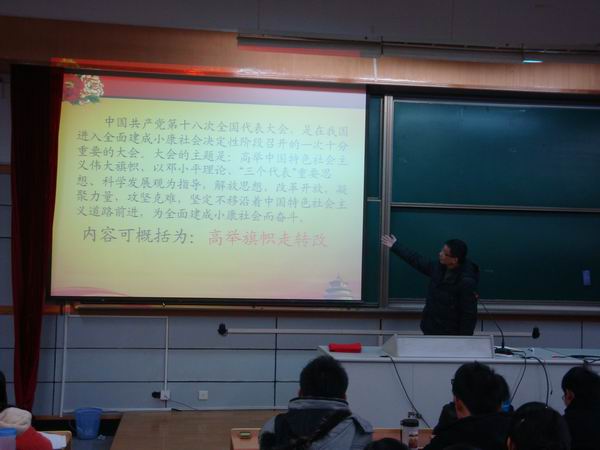 讲座开始, 冯群老师首先用一句话简要地概括了十八大的主要内容,即高举旗帜走转改。其中,“高举旗帜”就是高举中国特色社会主义旗帜,“走”就是坚定不移地走中国特色社会主义道路,“转”就是加快转变经济发展方式,“改”就是全面深化改革开放。之后,他又认真研读分析了胡锦涛主席的报告,认为当前形势对新青年提出了新的要求,并提醒在座各位同学,作为新时期的大学生,一定要贯彻学习党的方针政策,明确自身肩负的责任和使命,树立正确的世界观、人生观和价值观,时刻响应党的号召,为中国特色社会主义伟大事业贡献自己的力量。他还指出,党的十八大报告将生态文明建设纳入了中国特色社会主义事业总体布局,与经济建设、政治建设、文化建设、社会建设并列,从“四位一体”发展为“五位一体”,并首次提出建设“美丽中国”,这一举措宣示了中国努力走向社会主义生态文明新时代的决心和毅力,具有重大的创新意义。