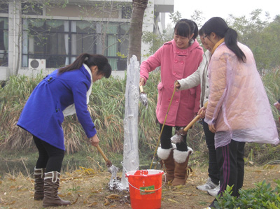 活动当天,志愿者们准时来到集合点,五人一组,在后勤服务集团绿化部门员工的带领和指导下,志愿者们在了解了石灰要搅拌均匀,刷树的厚度要适宜,刷树的高度要以一米竹竿为标准等刷树的基本要领后,拿着刷冬树所需的水桶、刷子、石灰粉及竹竿等工具,纷纷在指定区域行动起来。不久,一棵棵的树便穿上了新衣。