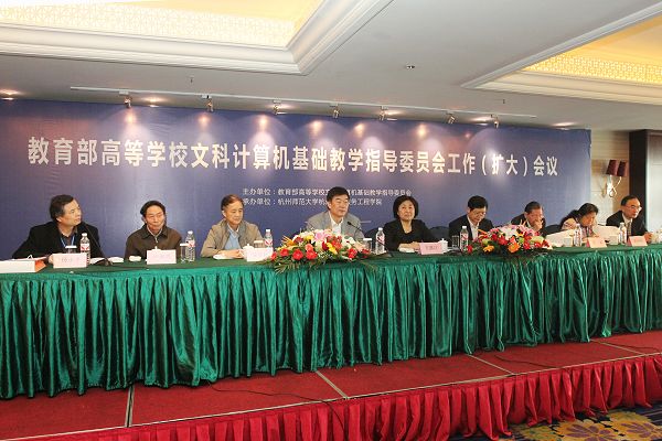 教育部高等学校文科计算机基础教学指导委员会主任、北京语言大学党委书记王路江,教指委秘书长、北京语言大学卢湘鸿教授,教指委副主任、中国人民大学杨小平教授,教指委副主任、对外经贸大学陈恭和教授,教指委副主任、西北大学耿国华教授,教指委副主任、浙江大学耿卫东教授,我校党委书记崔鹏飞,副校长杨磊教授,杭州师范大学服务工程研究中心主任张森教授,国服院执行院长詹国华,党委书记陈永强,副院长祝建中、谢琪、袁贞明出席大会。