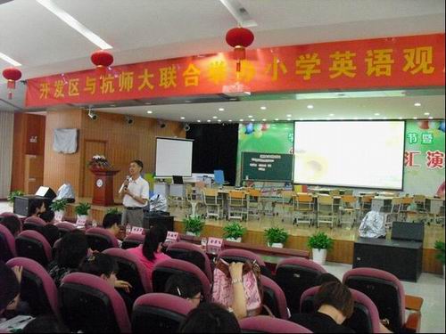 为了拓展在职教师与职前教师的英语教学创新思维,推动任务型教学的实施,近日,外国语学院与开发区社发局主办、学正小学承办的开发区小学英语观摩课活动在学正小学正源楼报告厅如期举行。出席本次活动的有我院刘喜文副院长,学正小学徐春芬副校长,开发区社发局教研室沈小玲老师,我院刘齐宣教授、研究生办公室主任朱越峰老师和西湖区首席英语教师金菲飞老师。开发区各小学英语教师和我院本科生、研究生也到场观摩。
