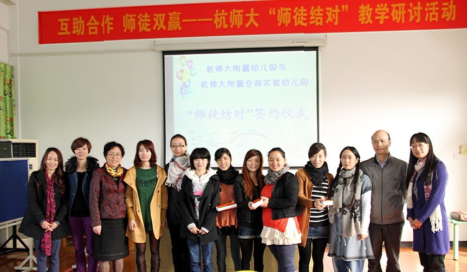 2012年11月2日上午,杭师大幼教集团结对余杭艺术教育集团幼儿园的第二期项目结对仪式暨教学研讨活动在仓前实验幼儿园举行,参加结对仪式的有杭师大教师教育管理处处长项红专、项目主持人-初等教育学院院长徐丽华,还有杭师大初教院项目联系人、艺术教育专业教师、杭师大幼儿园的“师傅们”、仓前实验幼儿园的领导和“徒弟们”。