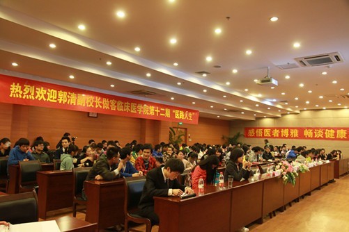 相约医路,聚首人生,临床医学院第十二期医路人生在叙伦厅圆满举行。本期“医路人生”我们荣幸地邀请到了杭州师范大学副校长——郭清,出席本次活动的嘉宾还有临床医学院党委书记王卫民、副院长李国雄、党委副书记冯涯、团委书记张凯及各年级的辅导员。郭清教授的报告深受同学欢迎,早早地同学们便到现场等候郭清教授的到来,现场座无虚席。