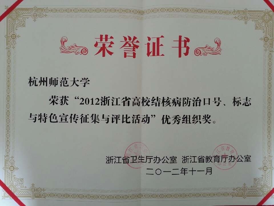近日,从2012年浙江省高校结核病防治宣传活动中传来好消息,我校荣获优秀组织奖。本次活动经过学校初评与推荐,省级复评和专家终评,最终共有包括我校在内的5家院校获优秀组织奖。