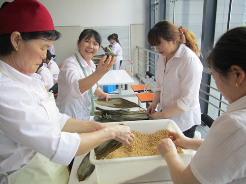 为继承和弘扬端午民俗文化,丰富员工业余文化生活,同时也给师生员工提前送上端午节日祝福,近日,饮食服务中心党支部联合工会小组、团支部开展了“包粽子,比手艺;迎端午,赠祝福”系列活动。