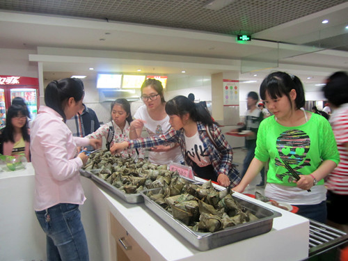 5月22日中午,饮食服务中心在下沙和园美食汇、仓前恕园二楼餐厅开展“粽叶飘香,情浓端午”免费送粽子赠祝福活动,将比赛所包的粽子赠送给现场刷卡就餐的师生。有位女同学领到粽子后高兴地说:“因为在‘杭师大后勤微信’、后勤微博上看到了赠送粽子的消息,我很早就过来等着了,没想到还有这么好的福利啊,还是阿姨们自己亲手包的。”据悉,当天两个校区总计赠送粽子2000只。
