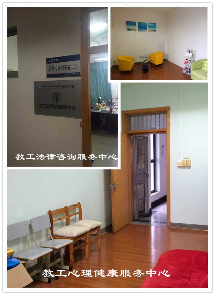 教工法律咨询服务中心:设在C号楼514室,是学院为帮助教职工妥善解决校内各类纠纷,建立稳定协调的劳动关系而专门设立的,旨在更好地维护全院教职工的合法权益。该组织依托法学专业为平台,为教职工提供优质免费的法律咨询服务。开放时间:双周周三13:30-16:30(平时可预约,节假日不值班),联系人:袁巧玲、朱俊洁,电话:28867795、28867005。