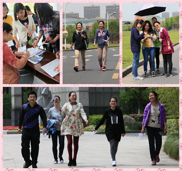 在学院工会的精心筹备下,50余名教职工参加了此次活动。活动路线从下沙校区南门出发,经过江畔牧羊,到达钱塘江畔,沿之江路、学源街,从校区北门到达西林广场,最后回到行政楼完成总行程。活动中大家谈笑风生,工会委员们一边定点盖章确认,一边抓拍大家兴致高昂的行进画面。