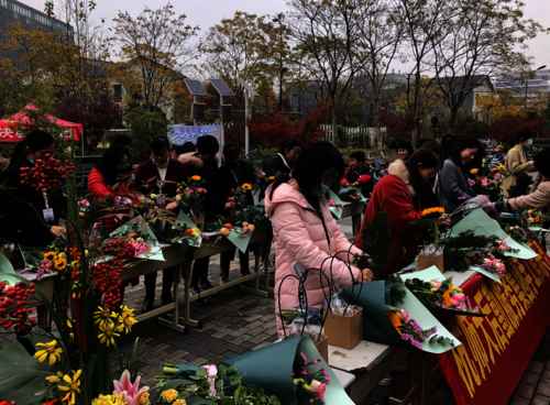 近日,集团手工俱乐部插花活动在仓前校区恕园8号楼餐厅门口举行,集团党委书记岑建旭,副总经理陈明章、集团工会主席傅向阳亲临活动现场。来自各个学院的23名学生代表、集团手工俱乐部22名会员参加活动。