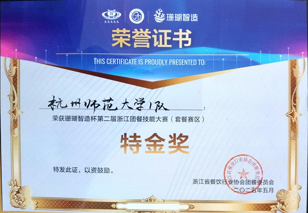 5月11日,珊瑚智造杯第二届浙江团餐技能大赛在杭州老板电器全球烹饪艺术中心隆重举行。本次大赛吸引了全省50多支优秀团队参赛,竞争异常激烈。饮食服务中心技术团队凭借精湛的烹饪技艺和卓越的创新能力,在众多参赛队伍中脱颖而出,一举夺得“特金奖”“金奖”“最佳营养搭配奖”及“摆台优胜奖”等多项殊荣,展现了团队在团餐领域的顶尖实力。