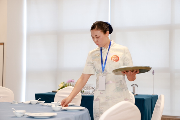 在摆台比赛中,仓前校区博雅苑餐厅主管助理陈林珍以“上善若水、勇立潮头”为主题,通过面塑技法展现潮涌神韵,台布与餐碟的设计更是巧妙呼应主题。她对每一个细节的严格把控,最终赢得了“摆台优胜奖”。