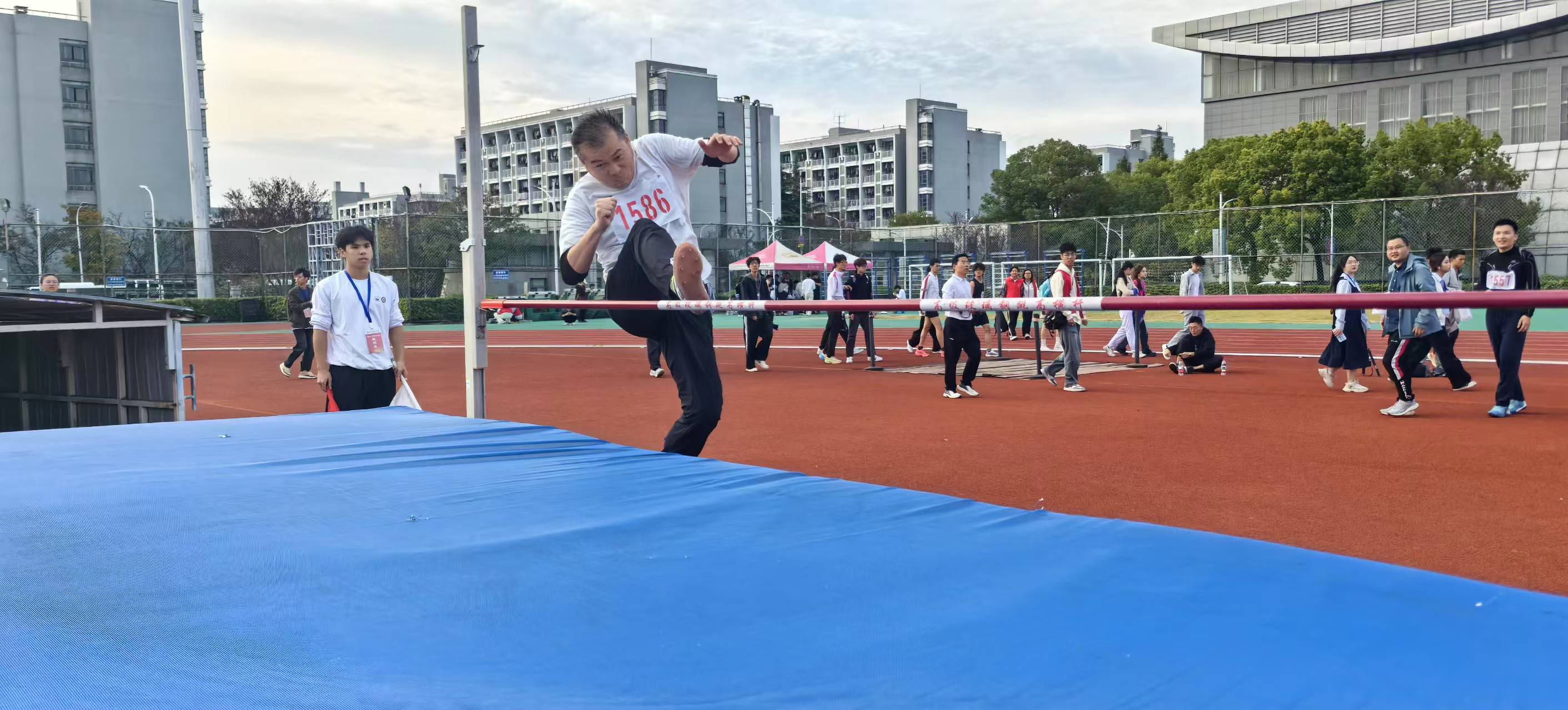 徐老师平时热爱运动,身高腿长,跳高比赛正是发挥了个人优势,祝贺他!也希望他在明天的比赛中取得好成绩!