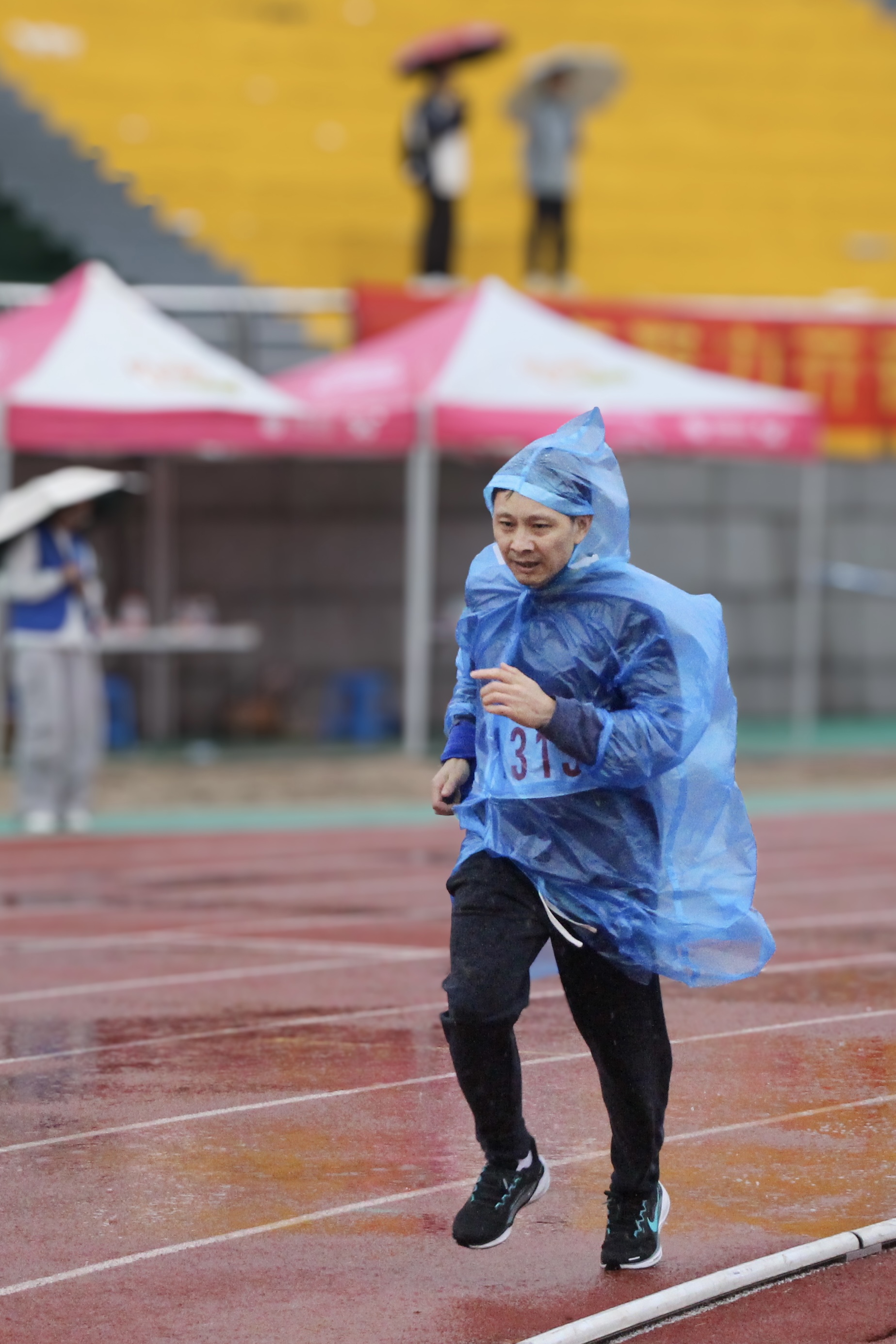 十月三十日下午十五时四十分,男子1500米决赛于阵阵秋雨中在南田径场拉开帷幕。马强才老师一袭蓝色雨衣,在跑道上奋力向前。雨水淅沥不绝,却未曾动摇他前进的节奏。尽管体力逐渐消耗,但马强才老师的步伐未见迟疑,他始终保持着均匀的呼吸与步频,直至最后冲线。这场比赛,不仅是对耐力的考验,更是对毅力的礼赞。马强才老师在雨中的奔跑,生动诠释了何谓坚持,也赢得了全场由衷的掌声与敬意。