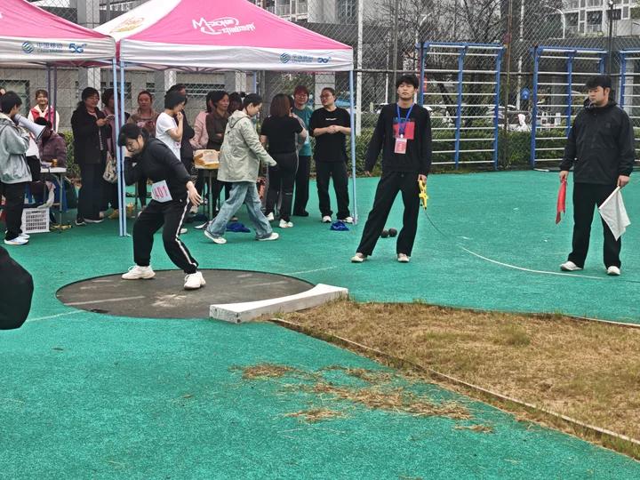 轮到他登场,全场目光聚焦。马锐老师深吸一口气,将铅球稳稳贴于颈侧,身体后转时肌肉紧绷蓄力,下一秒猛地发力推掷!铅球带着力量划出弧线,重重落在远处沙坑,现场立刻响起生科院师生的欢呼呐喊。几轮投掷中,他始终保持稳定发挥,最终以优异表现跻身前五。