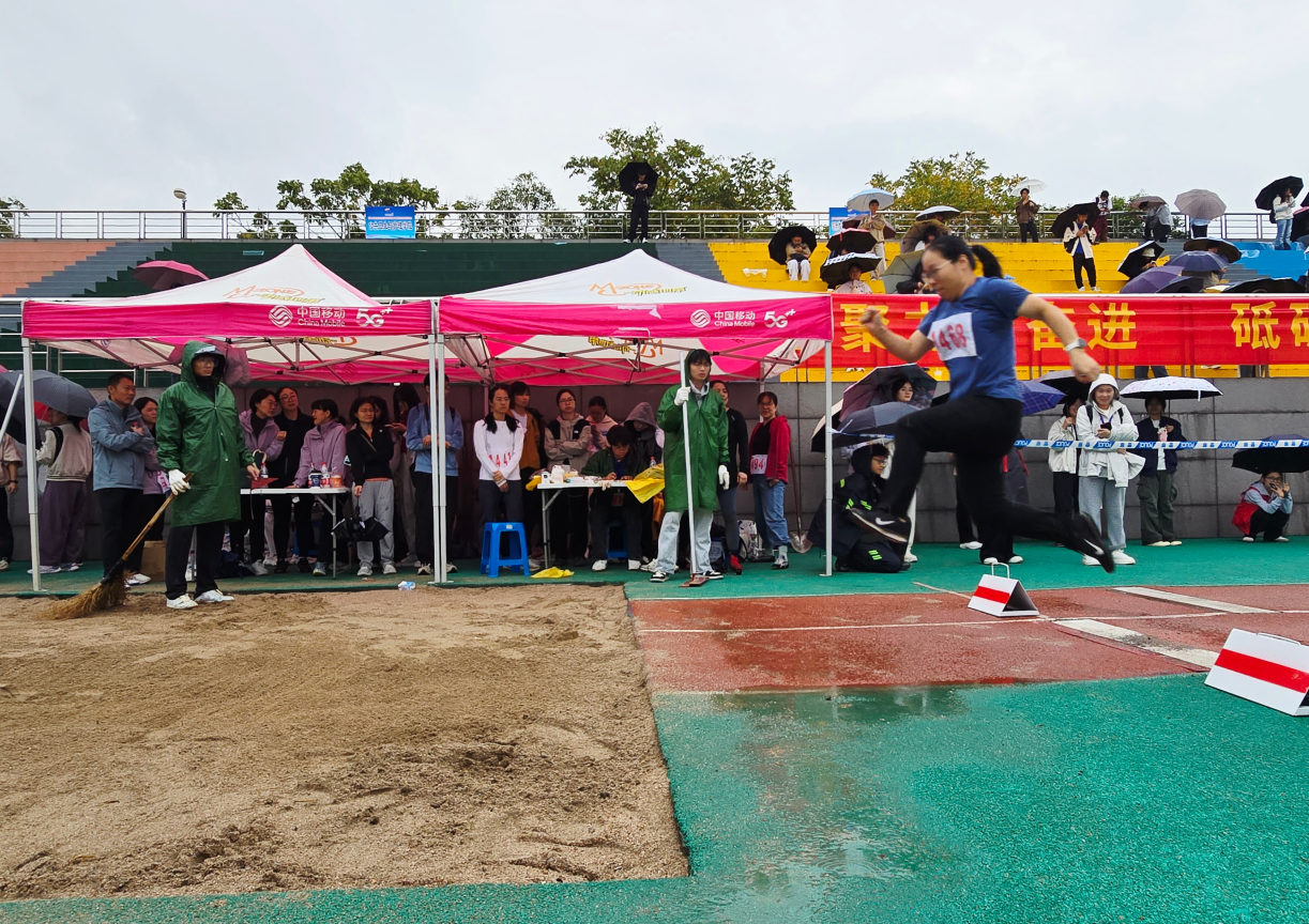 尽管秋雨绵绵,赛场湿滑,袁尘旦老师依然沉着应战。她在助跑、起跳、腾空、落地等一系列动作中展现出良好的身体素质和专业技术,每一次跃起都凝聚着平时刻苦训练的汗水,每一次落地都赢得了现场观众的掌声。