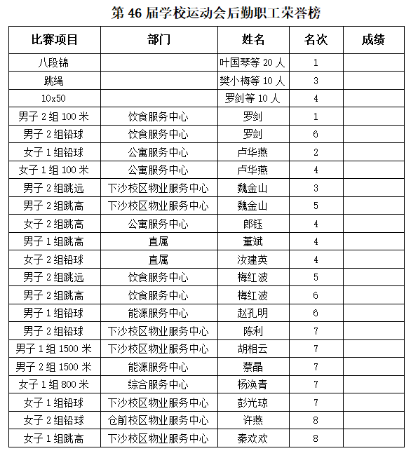 金秋送爽,丹桂飘香。10月29日-10月31日,我校第四十六届田径运动会在下沙校区南田径场顺利举行。后勤中心工会积极组织,共选派50余名运动员参与了12个项目的激烈角逐,最终斩获了体育道德风尚奖第一名、团队总分第二名、八段锦表演第一名以及男子2组100米第一名的优异成绩,充分展现了后勤员工团结拼搏、锐意进取、追求卓越的精神风貌。