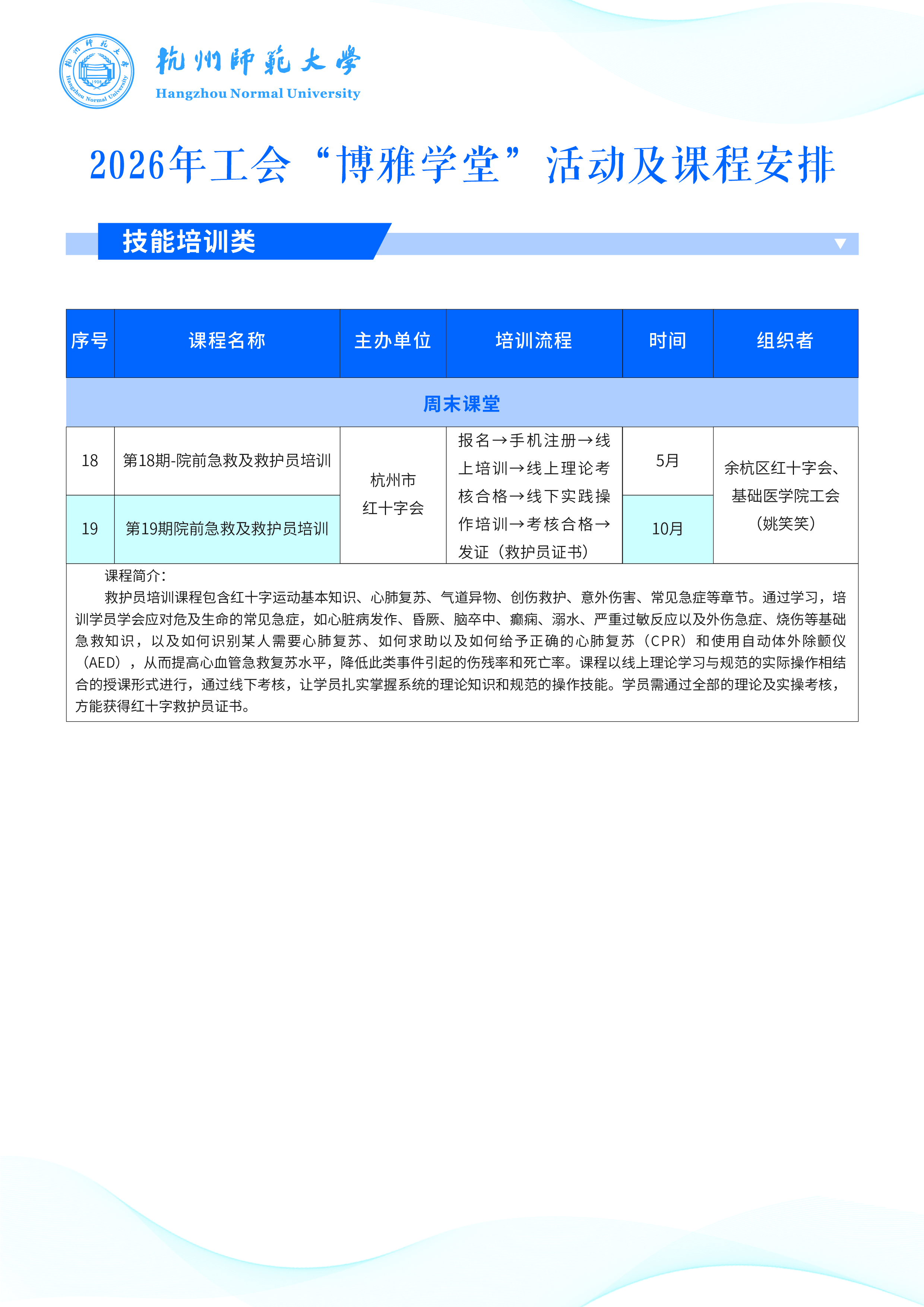 1. 培训课程报名在数智工会完成。开课第一周为体验课,体验后不适合可取消, 正式课程从第二周开始并计入考勤,到课率低于2/3,系统将自动记入轮空库,下学期无法报名。