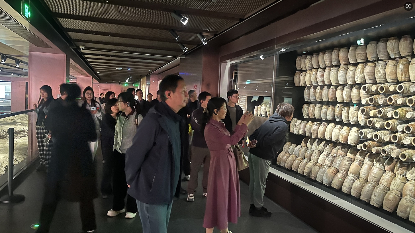 首站来到衣锦城遗址博物馆。在讲解员的引导下,老师们参观了这座深埋地下、今年年初才对外开放的遗址——它见证了吴越国的千年历史。考古发掘出的城墙基址、方井、酒窖及生活器物,仿佛将大家带回千年前的吴越故地,让人真切感受到那段“保境安民、善事中原”的厚重历史。