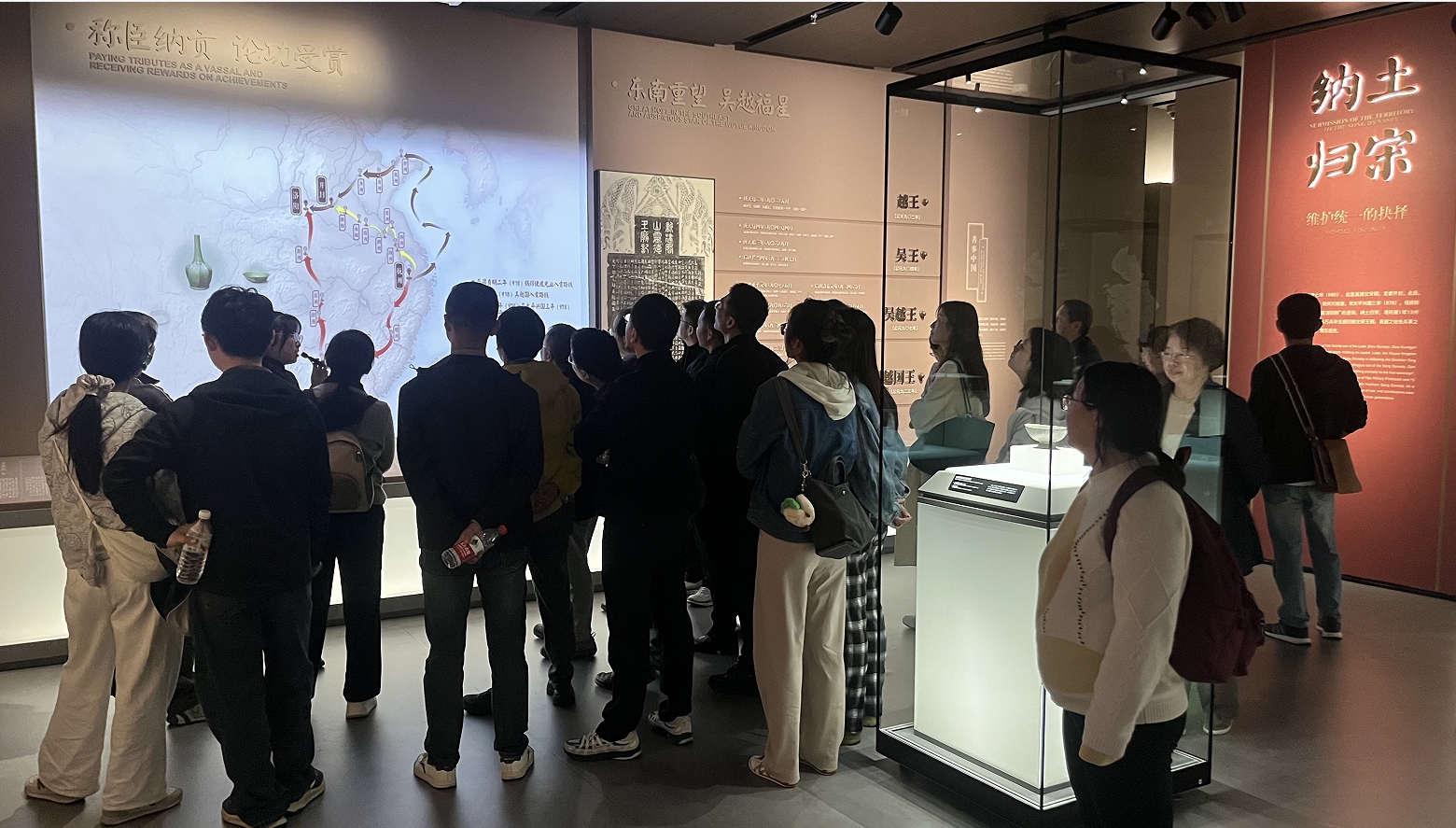 随后,一行人来到吴越文化博物馆。馆内丰富的文物藏品与翔实的图文展陈,系统呈现了吴越国三代五王治下的政治、经济与文化成就。当年吴越国北至苏州、南至福州的辽阔疆域,让老师们既感惊讶,也生自豪。大家驻足细观,不时交流探讨,对钱氏家族“纳土归宋”的历史抉择及其深远影响有了更深入的理解。