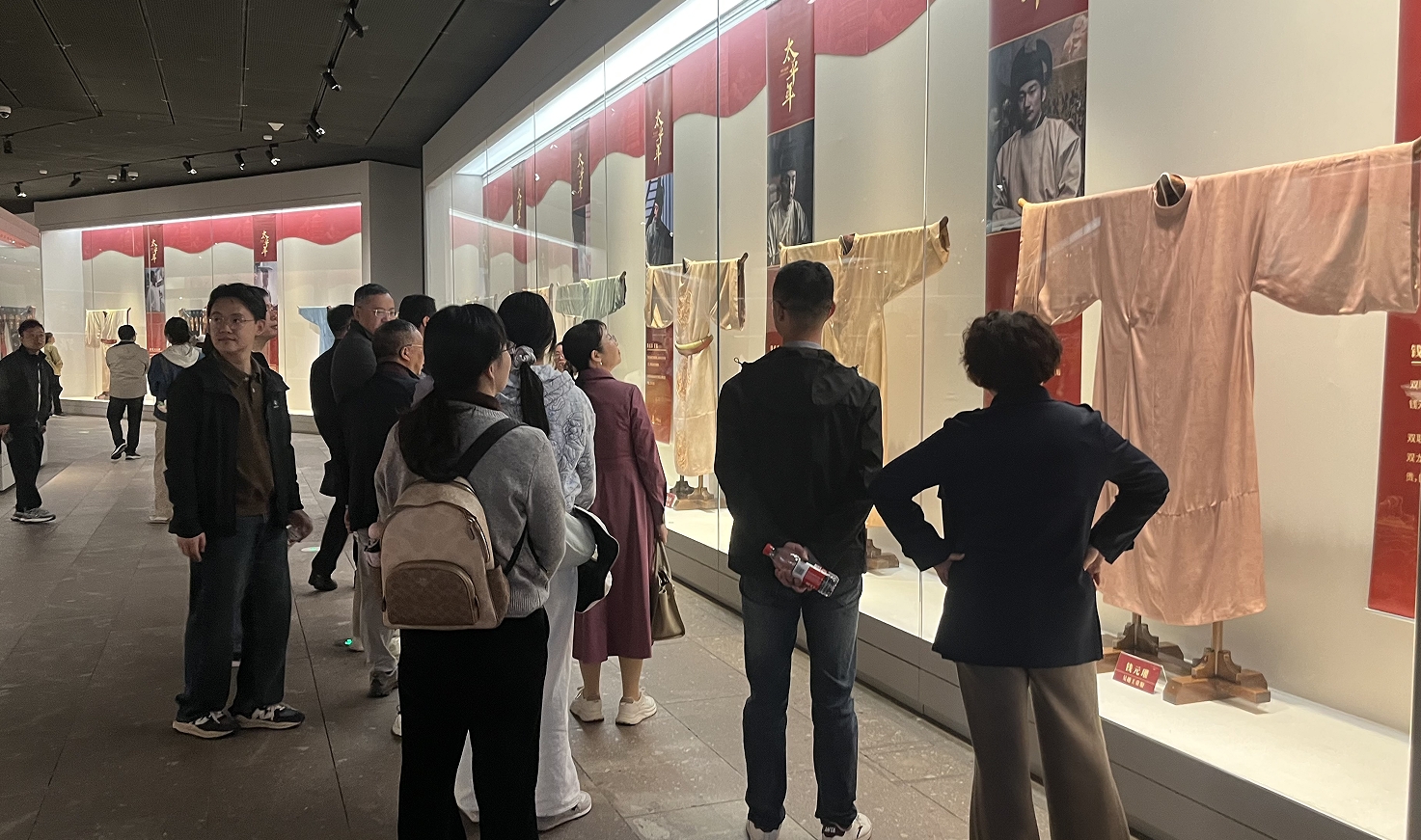 第三站来到临安博物馆,大家参观了正在展出的“太平年”服饰道具展。随着《太平年》的热播,22套精美的仿古服饰与道具生动再现了五代十国时期的衣冠风貌,老师们在沉浸式观展中,细细领略传统文化的独特韵味。大家一边观看,一边交流服饰的质地、君臣服饰的对比,以及剧中人物与演员的印象与评价,仿佛一同穿越回了那个风云际会的年代。